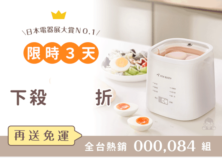 半小時前Pink Bunny智能煮蛋機智能控溫烹煮,營養美味輕鬆上桌 - Pink Bunny智能煮蛋機2入組 NT$1990